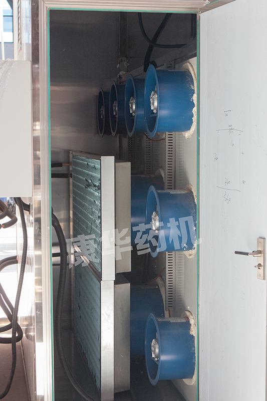 熱泵低溫蒸發(fā)器把流經(jīng)的空氣溫度降至露點溫度以下,使空氣析出水份(冷凝水由排水管排出烘干房外)。絕對溫度降低,再利用熱泵冷凝器加熱空氣,提高空氣溫度,降低相對濕度,產(chǎn)生高溫低濕的干燥空氣,干燥空氣流經(jīng)物料帶走水份再次回到蒸發(fā)器,形成干燥循環(huán),經(jīng)過多次干燥循環(huán)后,完成物料干燥作業(yè)。